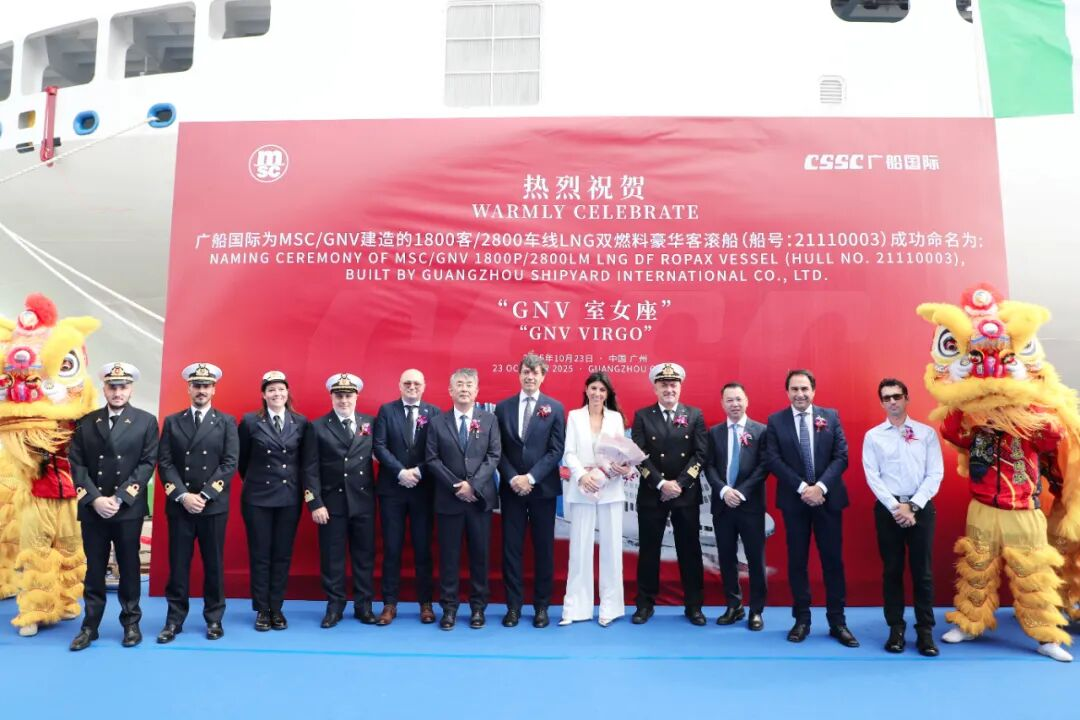 10月23日,由中船集团所属广船国际为全球领先的运输与物流企业MSC地中海航运集团旗下客渡轮运营商Grandi Navi Veloci(GNV)量身打造的一艘现代化大型绿色豪华双燃料客滚船——MSC/GNV1800客/2800米车道豪华客滚船“GNV·VIRGO(GNV·室女座)”号在广州南沙命名交付。