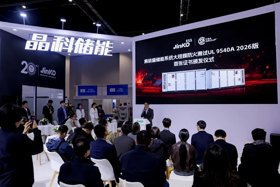 4月1日,晶科储能在第十三届储能国际峰会暨展览会期间,于首都国际会展中心B4C07展台隆重举行“集装箱储能系统大规模防火测试 UL 9540A 2026版首张证书颁发仪式”。