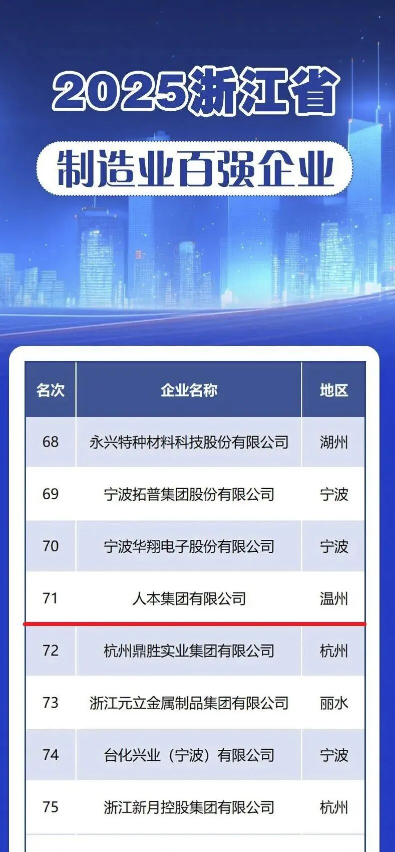10月15日,浙江省企业联合会、省企业家协会、省工业经济联合会正式发布了《2025浙江省百强企业》《2025浙江省制造业百强企业》等四项权威榜单。这也是该榜单自2003起连续第二十三次向社会公布。人本集团凭借稳健的综合实力,成功上榜《2025浙江省制造业百强企业》,位列第71名,较去年提升两位!