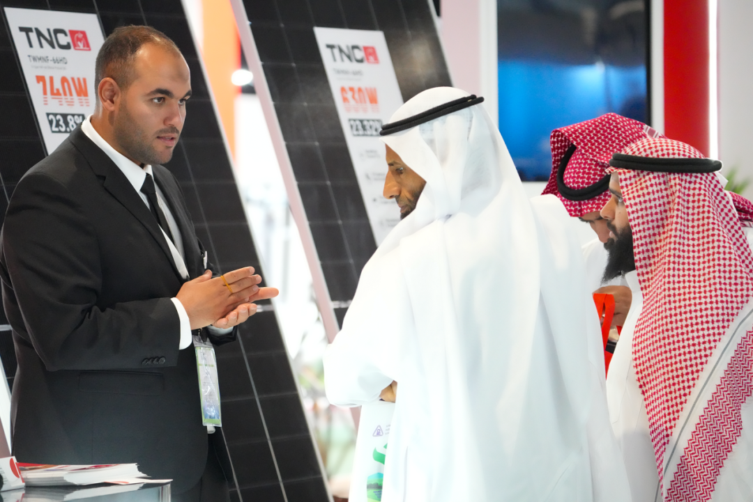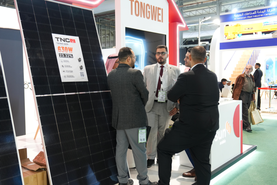 同时亮相的TNC“净界”防积灰组件,针对中东地区高温、多沙尘气候特点,通过优化边框结构,有效防止灰尘堆积造成的性能下降,为客户带来更持久、更稳定的发电表现。其薄A面结构与全包边框设计,不仅提升了长期可靠性与耐候性,也让组件外观更为简洁美观。结合通威在高效电池片与组件工艺上的持续创新,“净界”系列为沙特市场提供了更具适应性的高品质选择。