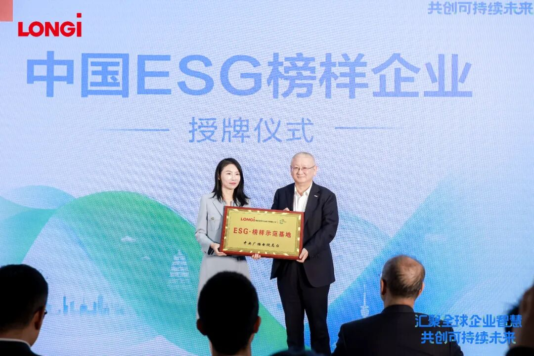 在圆桌会期间,中央广播电视总台财经中心活动部制片人、“中国ESG发布”暨榜样盛典负责人刘星向隆基绿能授予“ESG榜样示范基地”奖牌。