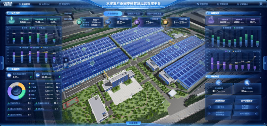 特变电工京津冀产业园采用数字化生产制造体系,打造了高端电力设备研发和智能制造生产基地。2024年4月,园区一期11.5MW分布式光伏投运。随后,二期光伏和光储充站竣工,空气源热泵完成气改电,应用物联网、大数据和模型技术打造的零碳智慧运营管理平台投入使用。源头脱碳、过程减碳、终端降碳、智慧管碳的零碳架构搭建完成,与园区智能制造“擦出火花”,和员工办公生活深度融合,有效推动生产用能成本稳步下降,碳排放显著降低。