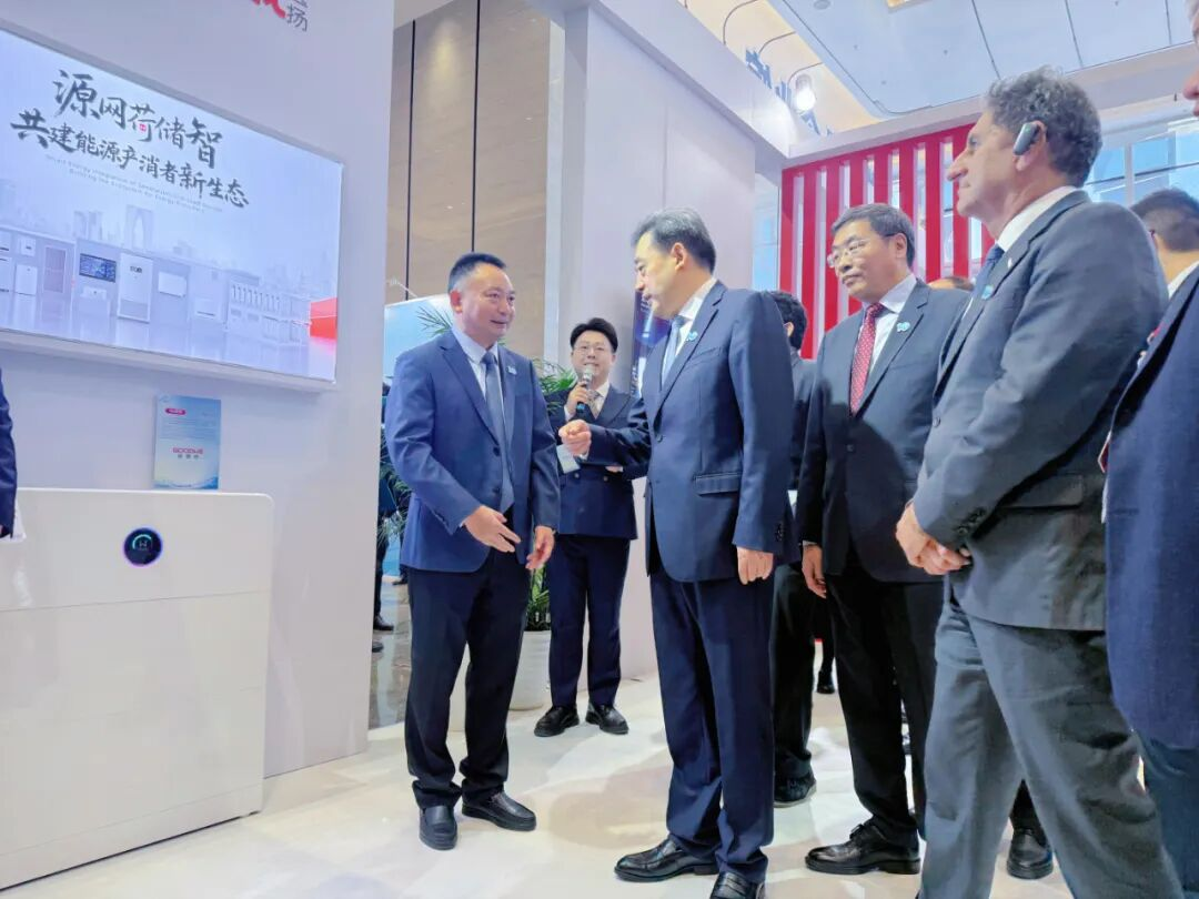 国家能源局局长王宏志等领导莅临固德威展台参观指导,黄敏董事长详细介绍了固德威以源、网、荷、储、智为战略的发展主线,以及光储产品、光电建材、空气源热泵、智慧能源、分布式光储系统开发,为全球提供户用、工商业和地面三大场景的整体解决方案。王宏志局长详细询问了固德威智慧能源融合领域的实践情况,并对固德威在国际能源变革中的担当表示肯定。
