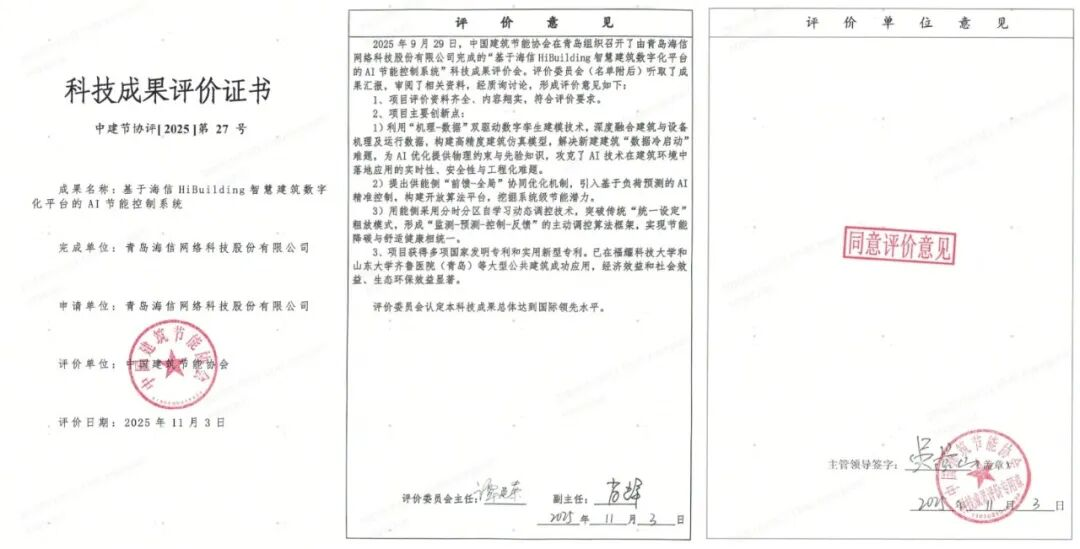 近日,中国建筑节能协会组织中国工程院院士,中国科学院、浙江大学、同济大学和清华大学教授,以及相关政府部门领导组成的评价委员会对《海信HiBuilding智慧建筑数字化平台AI节能控制系统》进行成果评价,认定本科技成果总体达到国际领先水平,并颁发科技成果评价证书。