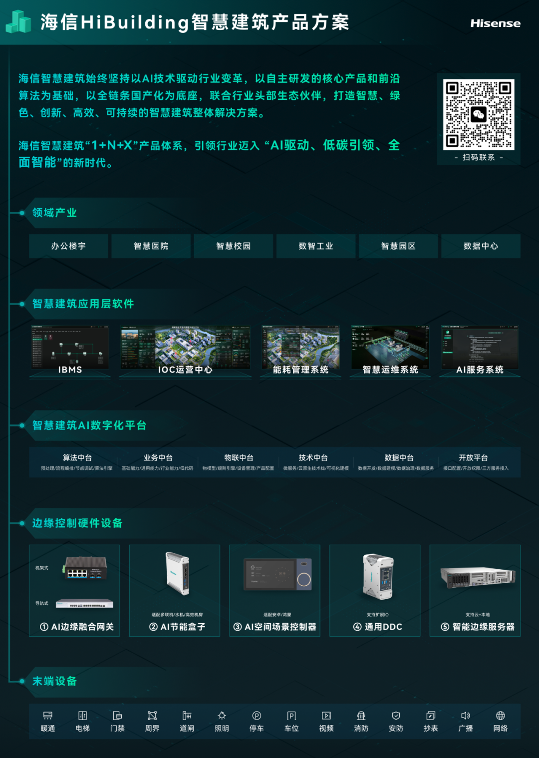海信HiBuilding智慧建筑数字化平台AI节能控制系统深度融合建筑机理与人工智能技术,适用于新建智能建筑和存量建筑节能改造。该系统由智慧节能算法平台与硬件节能盒子构成,实现系统性、精细化、全流程的节能效果。