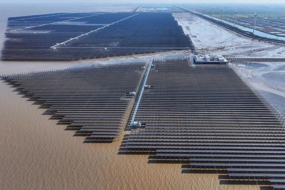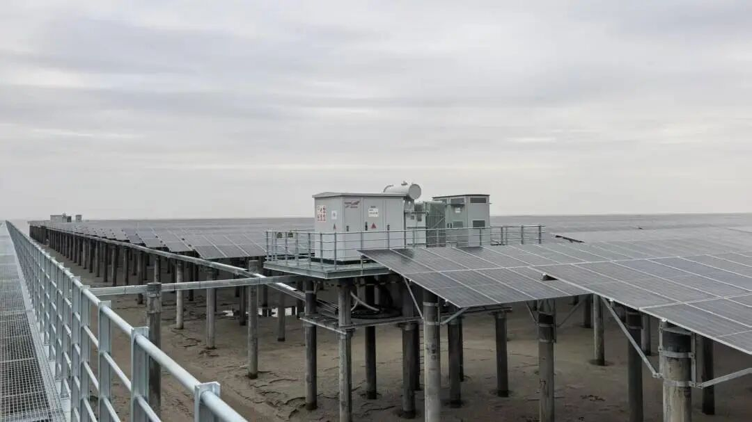 在黄海广袤无垠的滩涂之上,一排排光伏板逐光而列,一台台逆变器随着潮汐的涨落吸“光”吐“电”,点亮千家万户的璀璨灯火。这里正是全国规模最大的“光氢储一体化”海上光伏项目——江苏如东400MW光氢储一体化项目。