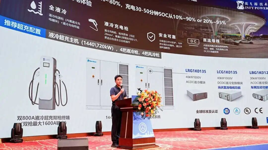英飞源高级产品经理何梓乐发表了主题演讲,从重卡电动化的发展趋势出发,深刻阐释了“以电替油”对国家能源安全的重要战略意义。随后,他系统介绍了英飞源面向不同场景打造的充电解决方案,涵盖重卡超充、高速服务区以及公共超充站等多个应用领域。