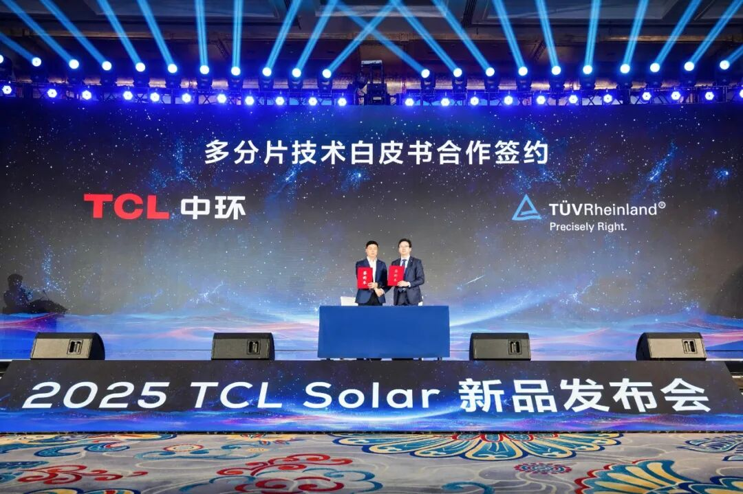 最后,行业首个多分片技术白皮书合作签约仪式在发布会上圆满举行。TCL中环副总裁、电池组件事业部总经理鞠霞与德国莱茵TÜV全球电力电子产品服务副总裁兼大中华区太阳能与商业产品服务副总裁李卫春登台完成签约,这一里程碑时刻既是双方携手共赢的见证,更是技术创新与权威认证的双向奔赴、强强联合。此次合作不仅凝聚了光伏产业技术共识,更以专业力量为行业高质量发展奠定了坚实基础。