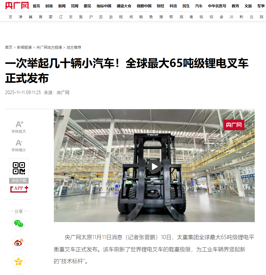 今日,央广网聚焦太重成功研制的全球最大65吨级锂电叉车发布文章,对其优异性能进行报道。该叉车的成功研制,展现出公司在绿色动力技术创新上的领先实力,为工业车辆领域竖起新的“技术标杆”。