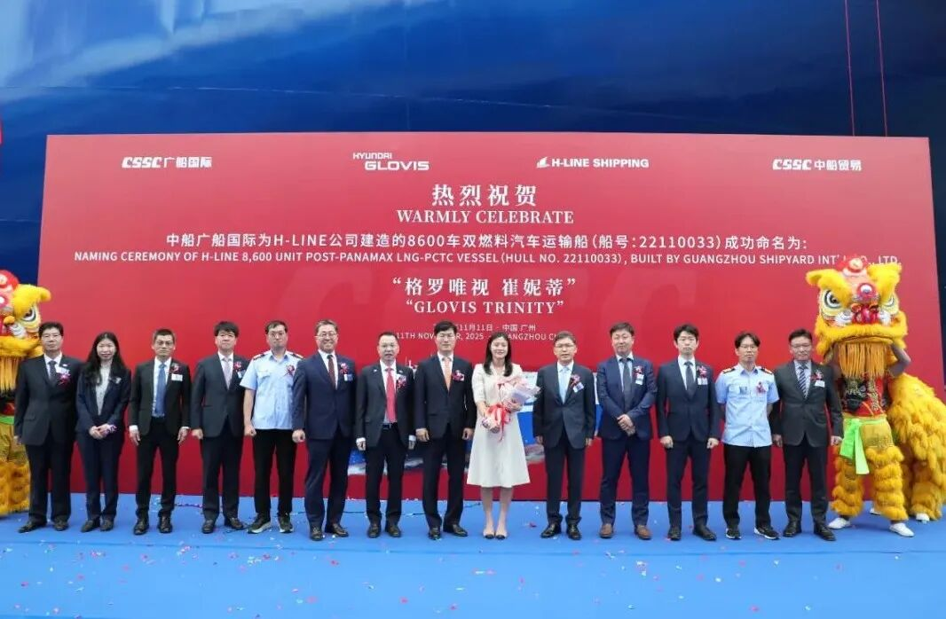 “三”番功成,“七”度辉煌。11月11日,中船广船国际联合中船贸易为韩国H-LINE航运公司建造的第7艘汽车运输船——8600车双燃料汽车运输船3号船在广州南沙命名,标志着该船东订造的7艘汽车运输船项目圆满收官。