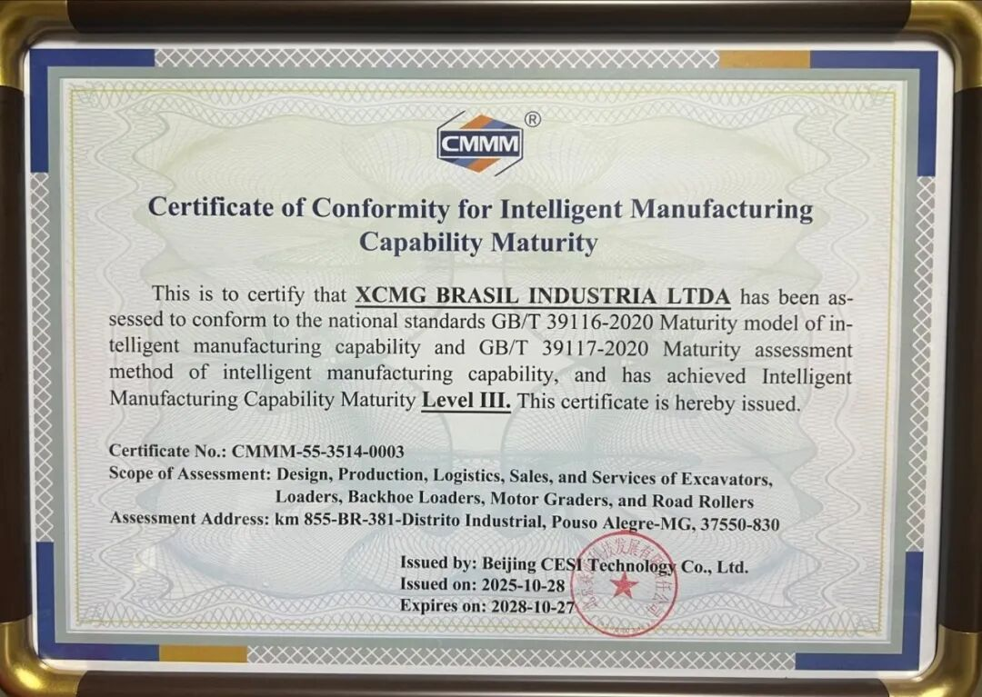 会上,智能制造专家委员会向首批海外工厂颁发CMMM证书。凭借深耕巴西市场十余年的数字化与智能化建设成果,徐工巴西荣获工程机械行业首个海外工厂CMMM三级认证,标志着中国先进的智能制造标准体系在海外大型制造基地成功落地。