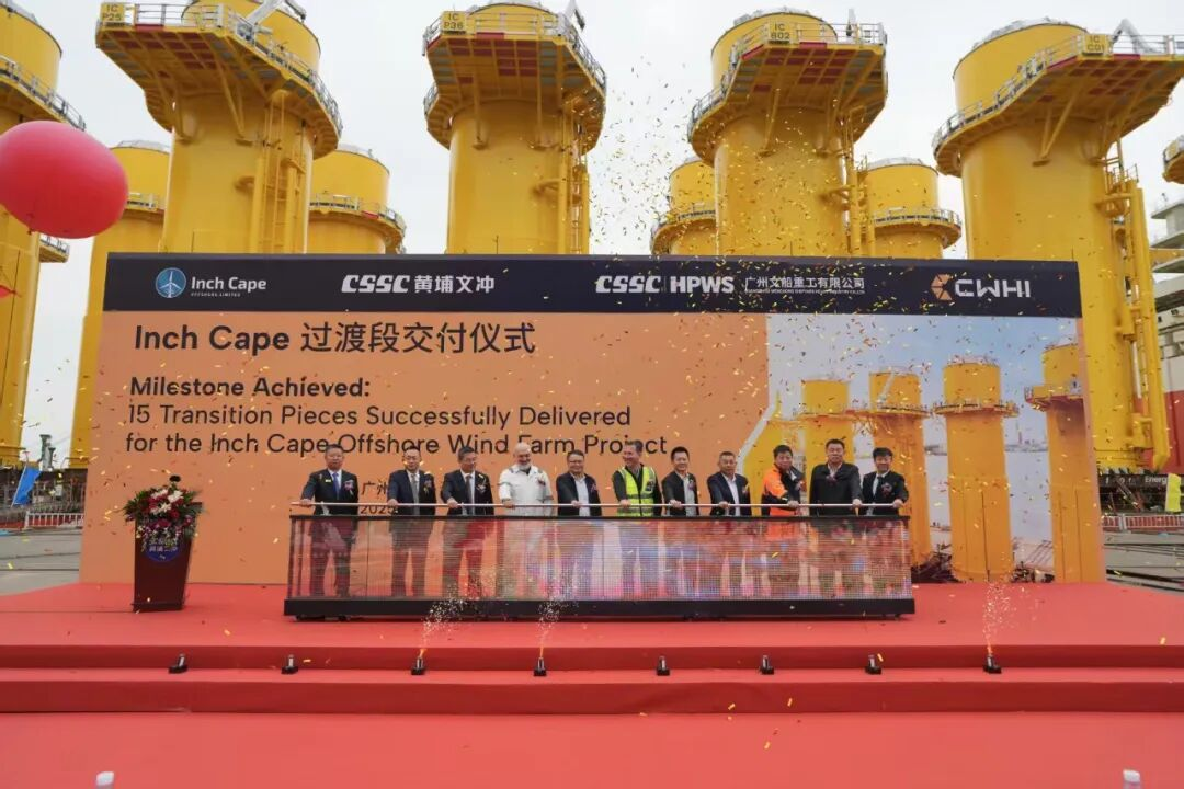 11月18日,中船黄埔文冲船舶有限公司下属文船重工承建的 Inch Cape TP 项目首批15个过渡段装船交付仪式在龙穴厂区举行,该项目成功交付标志着公司海工装备制造水平在国际高端市场实现重大突破。