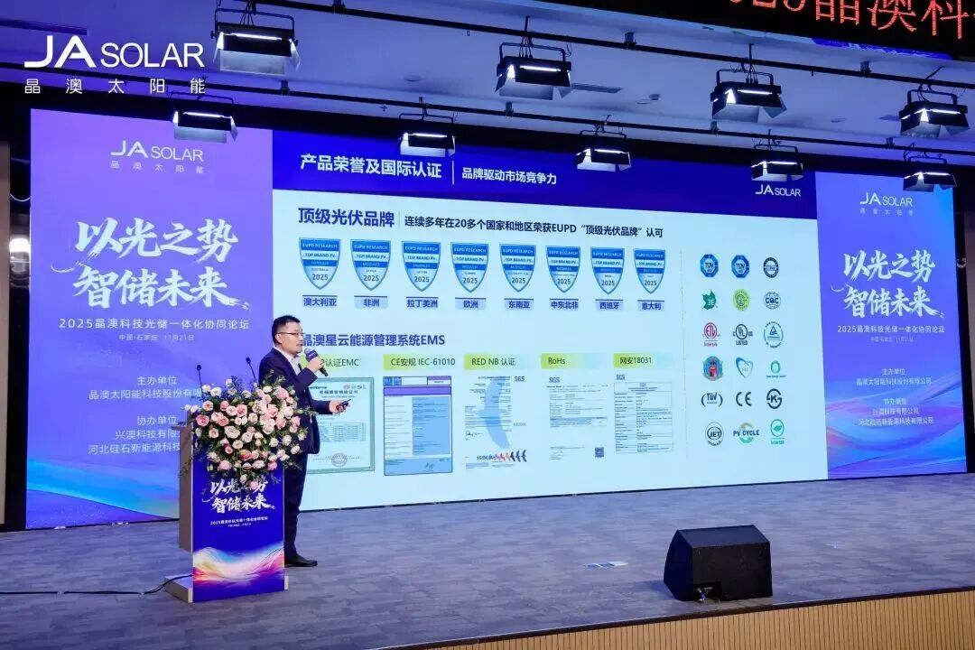 11月21日,由晶澳科技主办,兴澳科技有限公司、河北硅石新能源科技有限公司协办的“2025晶澳科技光储一体化协同论坛”在河北石家庄隆重举行。本次活动以“以光之势·智储未来”为主题,来自华北、鲁豫等北方区域的近300位核心经销商、贸易商、EPC客户及行业嘉宾齐聚一堂,共同探讨光储一体化发展新路径,见证晶澳科技在分布式光伏与储能融合领域的创新成果。