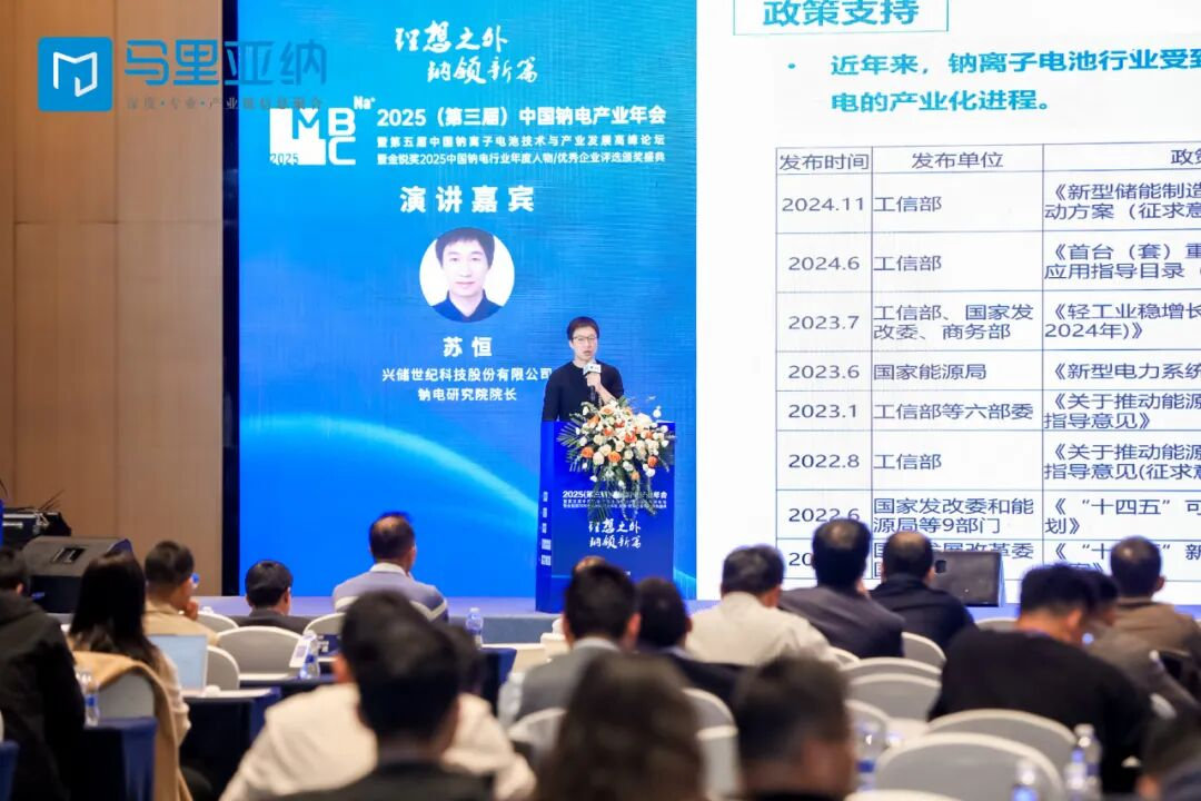 11月26-28日,“MBC 2025(第三届)中国钠电产业年会暨第五届中国钠离子电池技术与产业发展高峰论坛”在苏州举行。兴储世纪科技股份有限公司荣获“2025中国钠电行业年度品牌企业”称号,并受邀分享公司在钠离子电池研究方面的进展及钠电储能应用案例。28日上午,兴储世纪钠电研究院院长苏恒代表公司发表演讲。