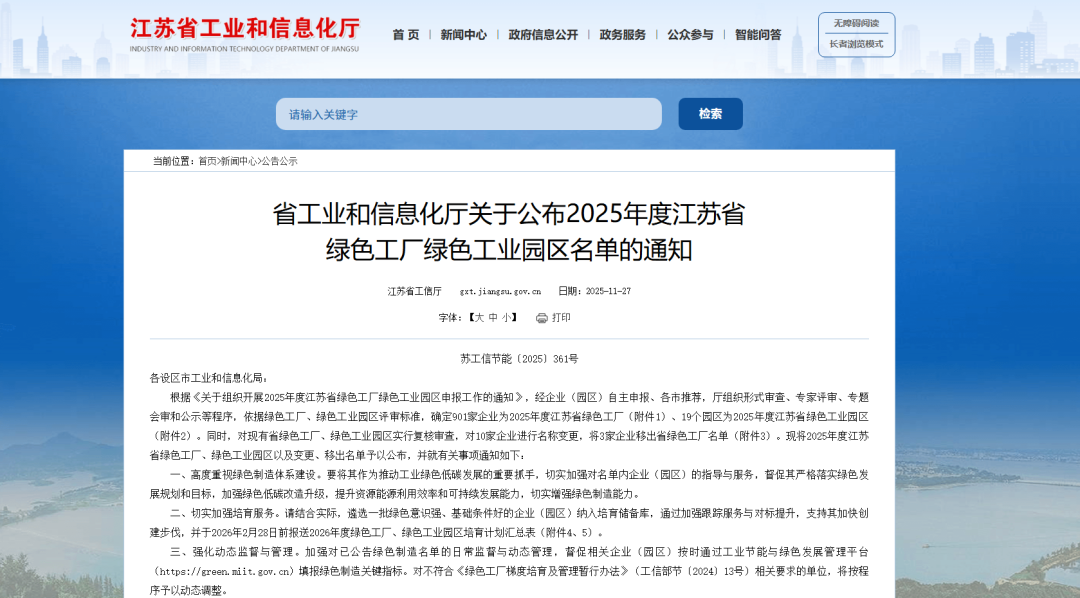 省级“绿色工厂”作为江苏省绿色制造体系的核心支撑单元,旨在推动制造业高端化、智能化、绿色化发展,加快构建绿色制造和服务体系。“绿色工厂”是指实现了用地集约化、原料无害化、生产洁净化、废物资源化、能源低碳化的工厂,是未来企业发展的主要形态。