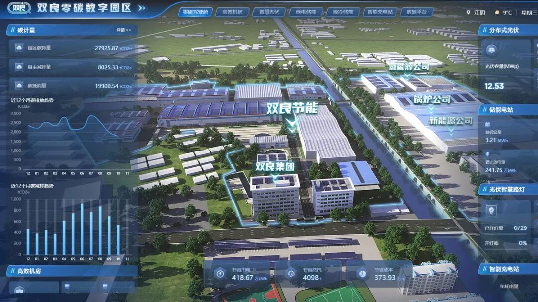 双良节能以自身产业园区为试点,推进零碳化与智能化的深度融合改造。通过分布式光伏、电化学储能、高效机房、智慧照明、光伏路灯、运输车辆电气化、余热利用及能碳管理平台等多重举措,打造零碳数字园区。工厂预计每年可减少二氧化碳排放三千多吨,先后斩获“国家级绿色工厂”“江苏省智能制造示范车间”“首批省级碳达峰碳中和试点企业”“五星级零碳工厂核查证明”等多项荣誉与认证。