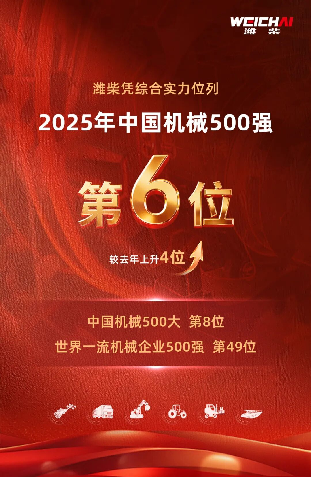 12月4日,由中国机械工业企业管理协会主办的2025年中国机械500强研究报告发布会暨中机企协业务总部启用仪式在江苏举办,潍柴凭综合实力位列“2025年中国机械500强”第6位,较去年上升4位;