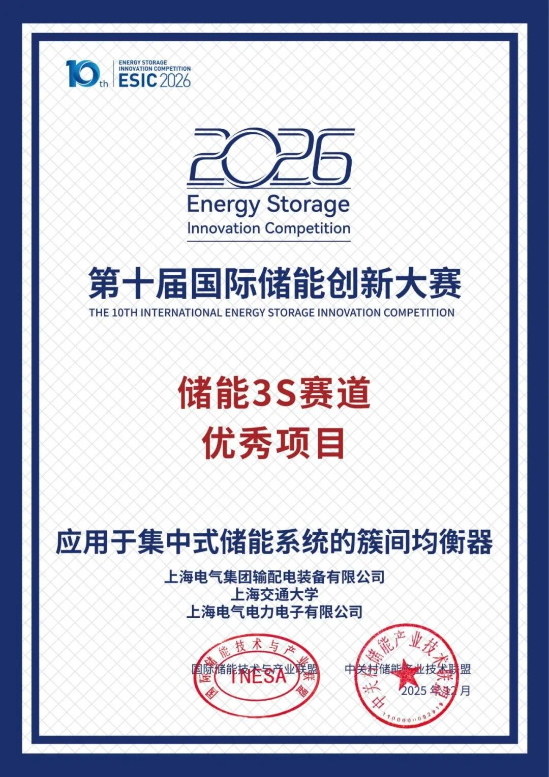 12月4日,上海电气电力电子有限公司协同上海电气集团输配电装备有限公司技术中心《应用于集中式储能系统的簇间均衡器》在2025中国储能CEO峰会暨第十届国际储能创新大赛预选赛中荣获储能3S赛道优秀项目奖。