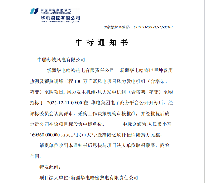 2025年12月19日,中船科技旗下中船海装正式获得新疆华电哈密巴里坤备用热源及蓄热调峰工程100万千瓦风电项目中标通知书,这是继新疆华电天山北麓610万千瓦新能源项目(标段三)后,中船科技在新疆区域拿下的又一GW级(100万千瓦)风电订单