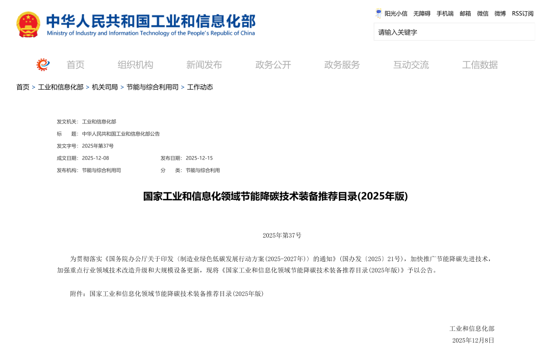 近日,国家工信部节能与综合利用司公布了《国家工业和信息化领域节能降碳技术装备推荐目录(2025年版)》(以下简称“推荐目录”),加快推广节能降碳先进技术,加强重点行业领域技术改造升级和大规模设备更新。