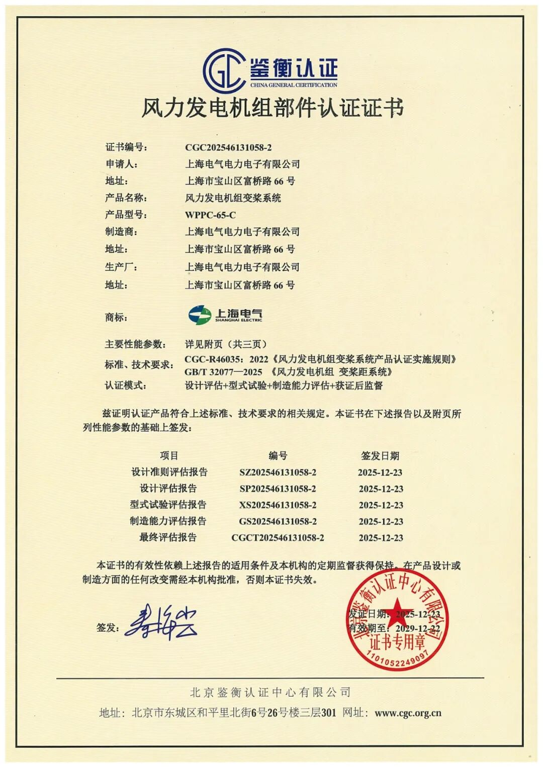 经过严谨的产品测试、文件审核与现场评估,我司的WPPC-45/65/80-C变桨产品完全符合新版国标的所有关键指标与技术规范,于近日成功获得由北京鉴衡认证中心颁发的认证证书。