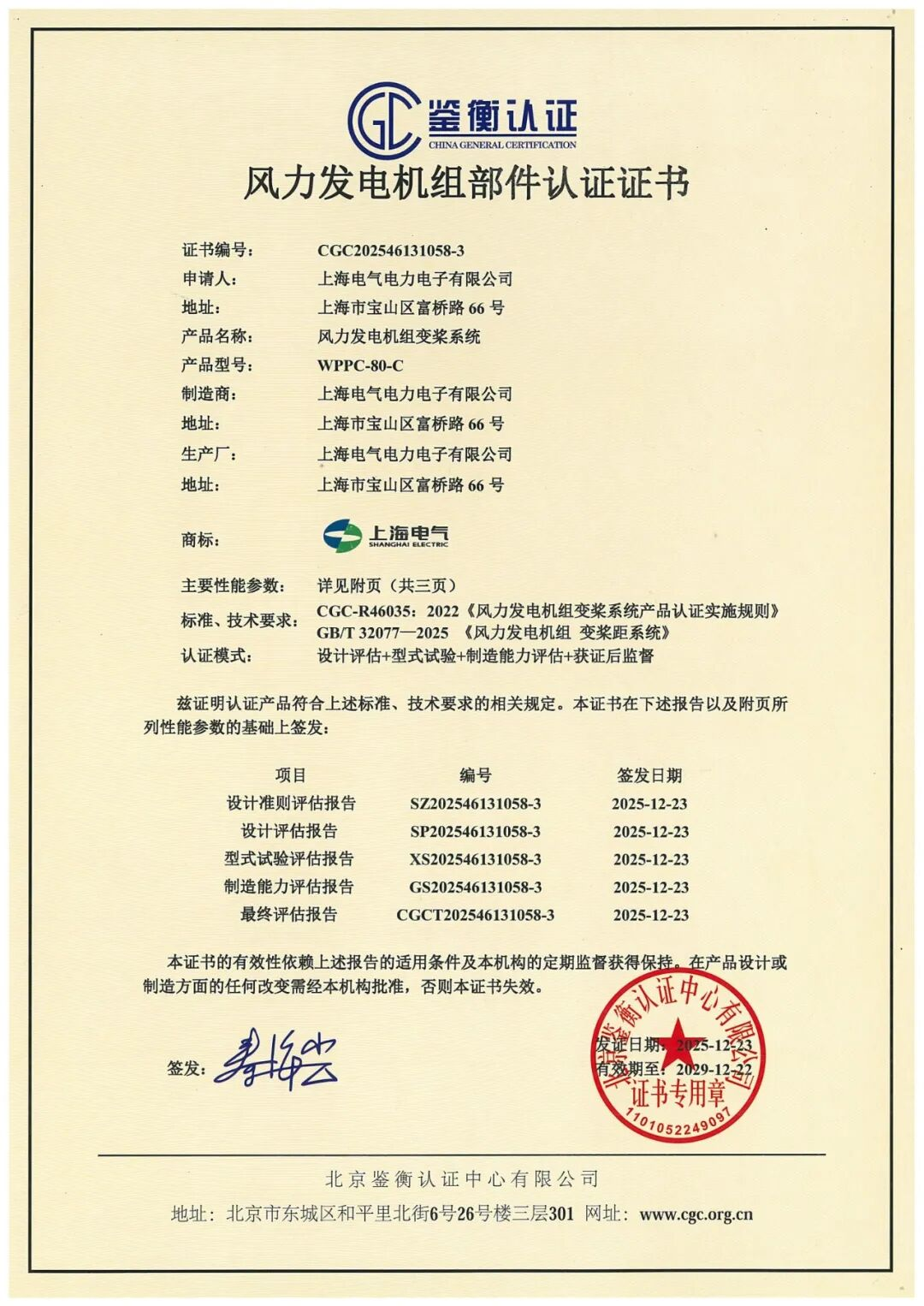 2025年11月,在新国家标准GB/T 32077-2025 《风能发电系统 风力发电机组变桨距系统》实施后的第一时间,上海电气电力电子有限公司作为标准的起草单位之一,迅速响应、积极对标最新技术要求,联系北京鉴衡认证中心启动公司WPPC-45/65/80-C三款产品的认证工作。经过严谨的产品测试、文件审核与现场评估,我司的WPPC-45/65/80-C变桨产品完全符合新版国标的所有关键指标与技术规范,于近日成功获得由北京鉴衡认证中心颁发的认证证书。