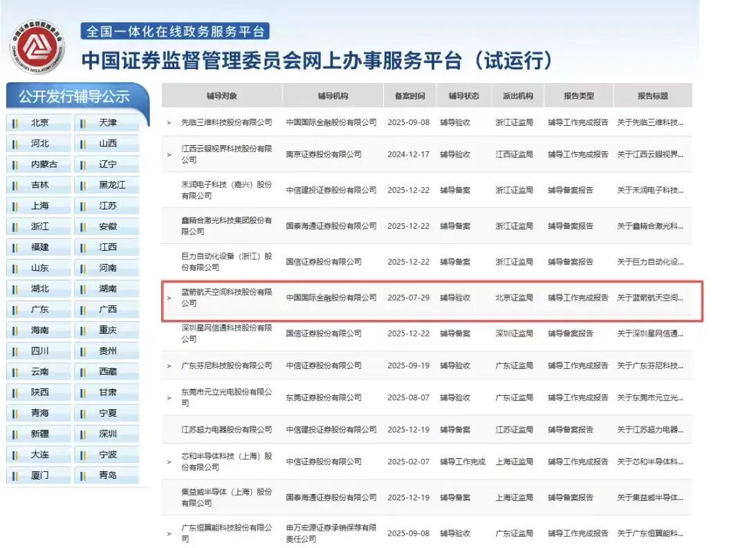 2025年12月23日,证监会官网披露,蓝箭航天IPO辅导正式完成,辅导机构中金公司已提交总结报告。这家成立十年的民营航天企业距登陆科创板更近一步,有望成为国内“商业航天第一股”