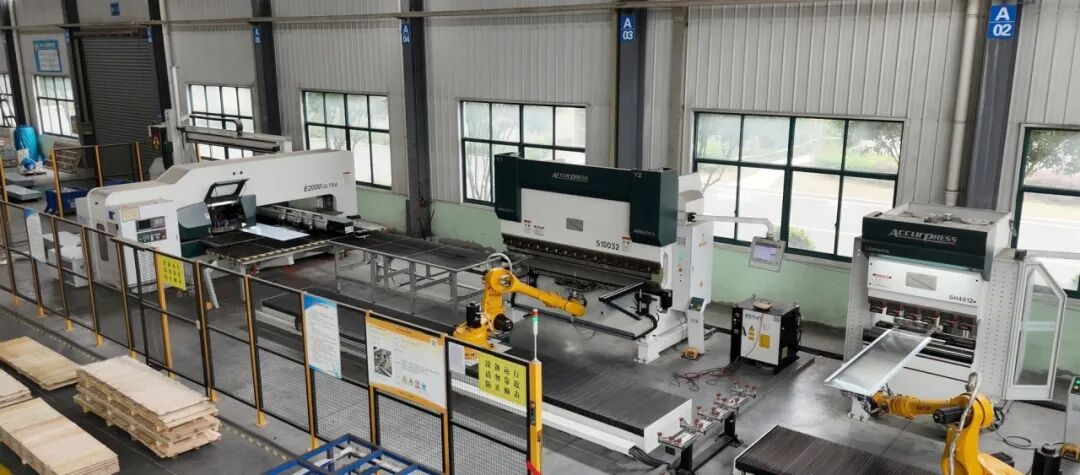 这条先进的板材柔性折弯生产线由一台冲床自动上下料和两台折弯机器人联动组成,实现了全流程自动化作业。