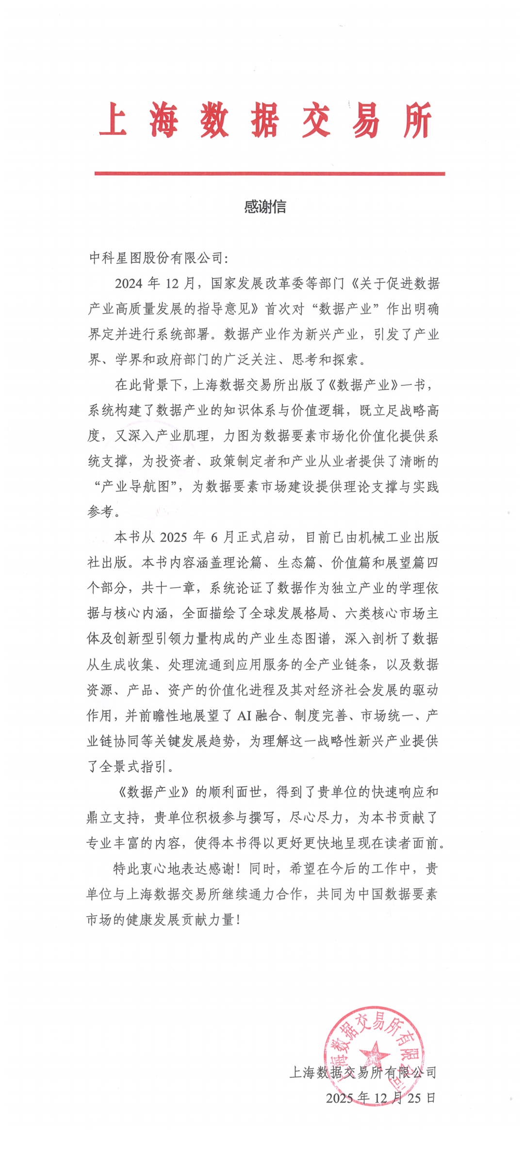 近日,上海数据交易所向中科星图股份有限公司(以下简称“中科星图”)发来感谢信,致谢公司在专著撰写中提供的专业支持与实践案例贡献。中科星图凭借在数据资源领域的突出实力,成功入选书中数据资源企业版块。