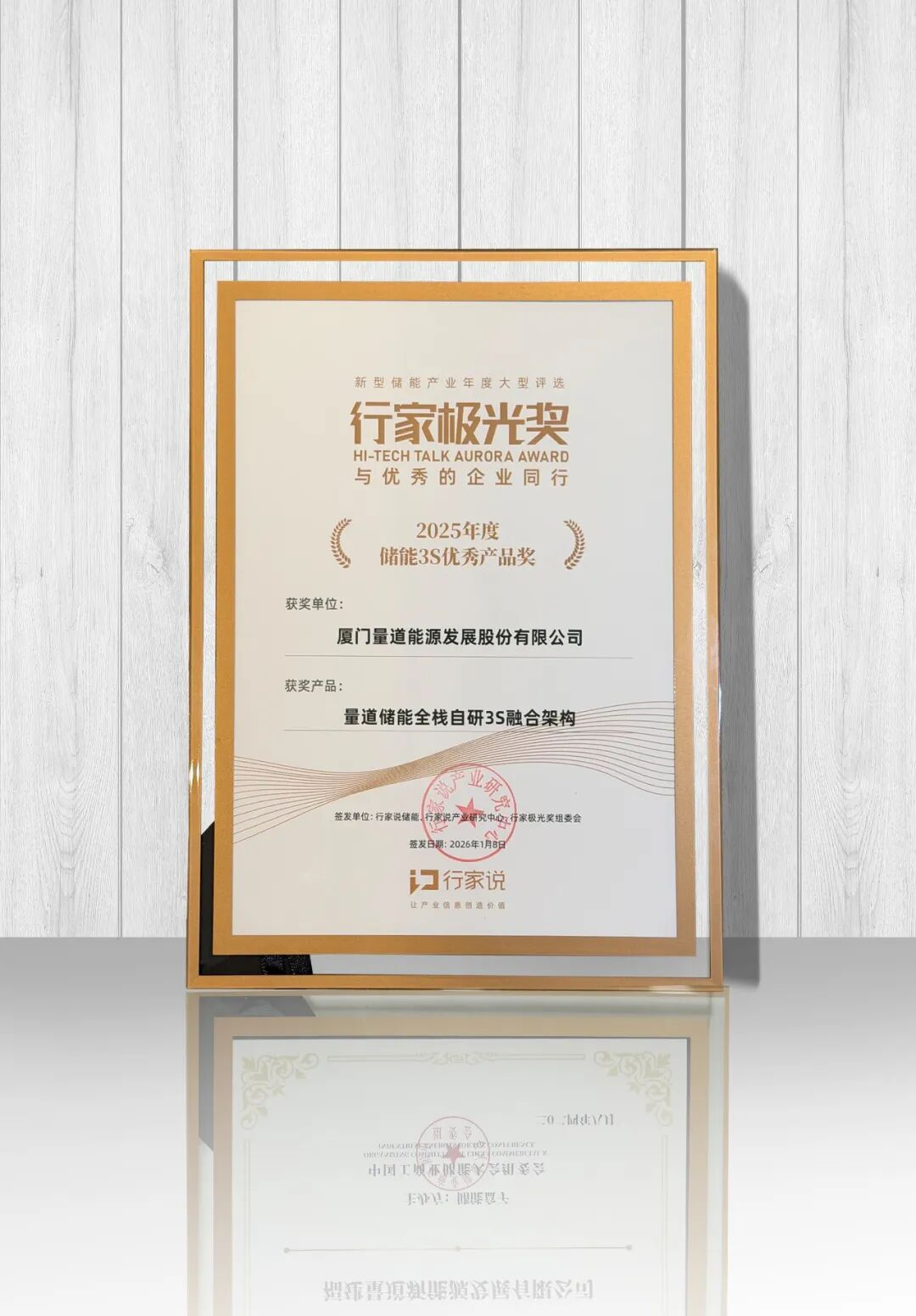 在刚刚结束的行家说储能2026开年盛会上,量道储能全栈自研的“3S融合架构”,凭借集约化设计和智能化融合的创新优势,荣获“2025年度储能3S优秀产品奖”。