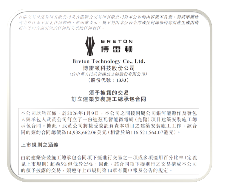 1月9日,博雷顿科技股份公司发布公告,旗下间接附属公司银河能源在刚果(金)投资建设的迪兹瓦智能微电网(光储)项目,已正式签署建筑安装施工总承包合同,合同金额14,938,662.06美元。该项目计划于2026年3月底完成建设并实现并网发电,进入实际运营阶段。