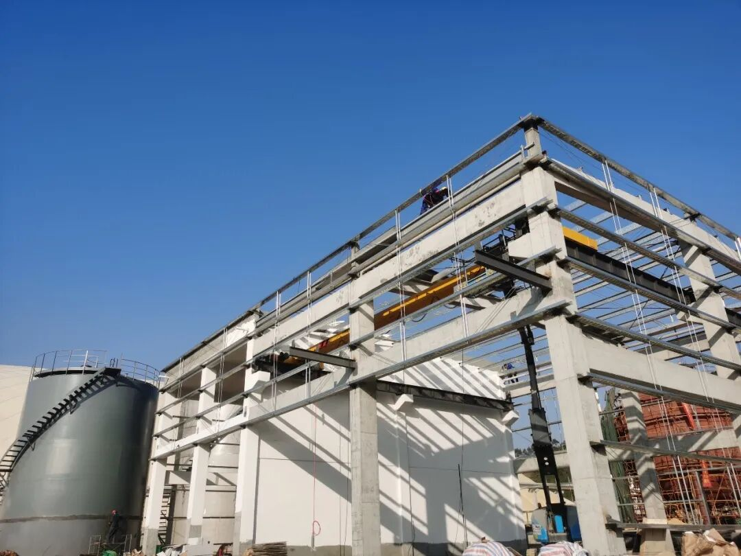 项目建设现场塔吊高耸、车辆穿梭、机械轰鸣,施工团队分区作业,稳步推进储罐区基础加固、构件焊接等关键工序,建材转运、设备调试等环节衔接紧密。主体综合楼内部砌筑、外部装饰及周边管网铺设正有序开展。