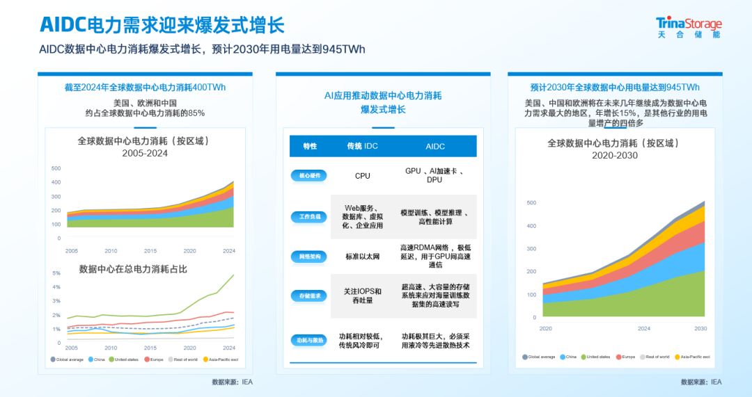 随着AI技术的快速演进,全球AIDC电力需求正步入爆发期。IEA数据显示,2024年全球数据中心用电量已达400 TWh,预计2030年将增至945 TWh,中美欧合计占比约85%,年均增长率高达15%,显著超越传统工业领域。