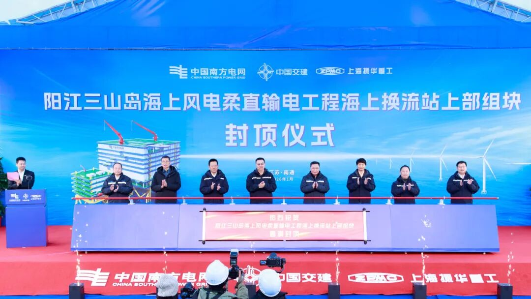 1月31日,上海振华重工集团参建的广东阳江三山岛500千伏海上风电柔直输电工程海上换流站顺利封顶。中国南方电网有限责任公司专家委员会副主任汤寿泉,广东电网有限责任公司副总经理闫国兵,中国能源建设集团广东省电力设计研究院有限公司党委副书记、总经理黄剑眉,上海振华重工集团党委书记、董事长由瑞凯等出席封顶仪式。