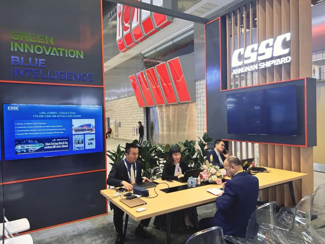 江南造船极具专业度的展台共计接待全球专业访客超过600人次,有国际能源公司壳牌、美孚、卡塔尔能源、道达尔能源、康菲、Eni、马国油、切尼尔、Woodside、Uniper、阿曼LNG、康菲、Venture Global等,还有MOL、NYK、Kline、IINO、中远海能源、山东海洋能源、招商气运、MISC、Asyad等国内外知名船东,CCS、DNV、LR、ABS、BV以及薄膜型专利技术公司GTT等。来宾对江南展示的各类船型和自主B型舱技术方案表现出浓厚兴趣,开展了商务与技术交流。同行业的韩国现代重工、三星重工、韩华海洋也在江南典型主建船型旁驻足观看,并和江南团队交流讨论。