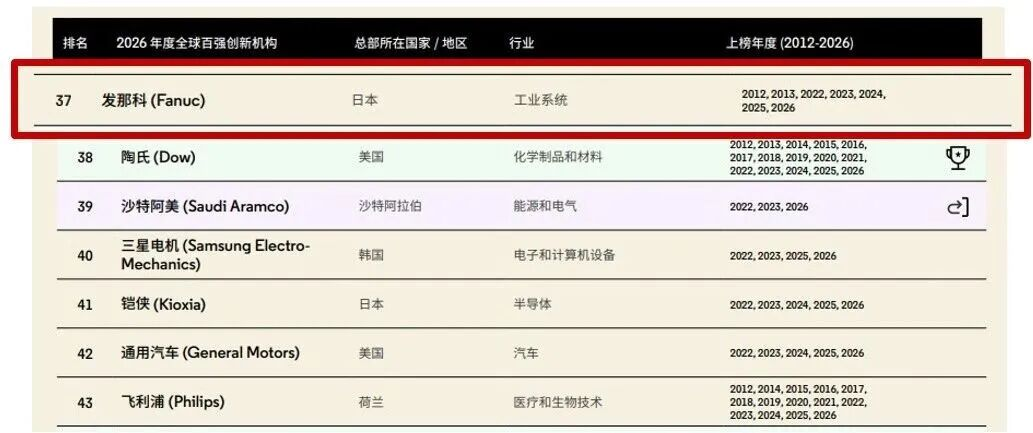 近日,全球专业信息服务提供商科睿唯安(Clarivate)揭晓“2026年全球百强创新企业”榜单,FANUC凭借领先的创新和研发实力荣登榜单,这是FANUC第七次,也是连续第五年获得此殊荣。