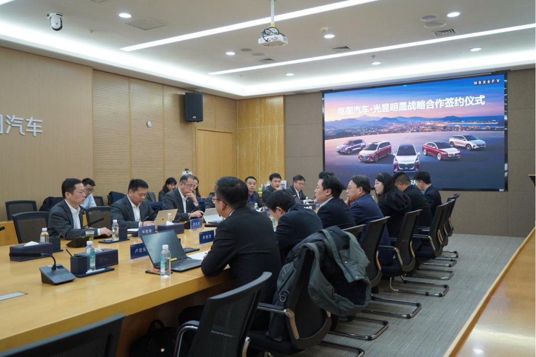仪式现场,在岚图汽车董事长、党委书记卢放博士和光昱明晟执行董事朱敦尧博士的见证下,岚图汽车高级总监罗志浩与光昱明晟总经理苏晓聪代表双方正式签署战略合作协议。