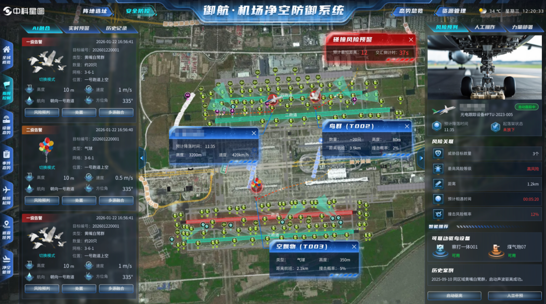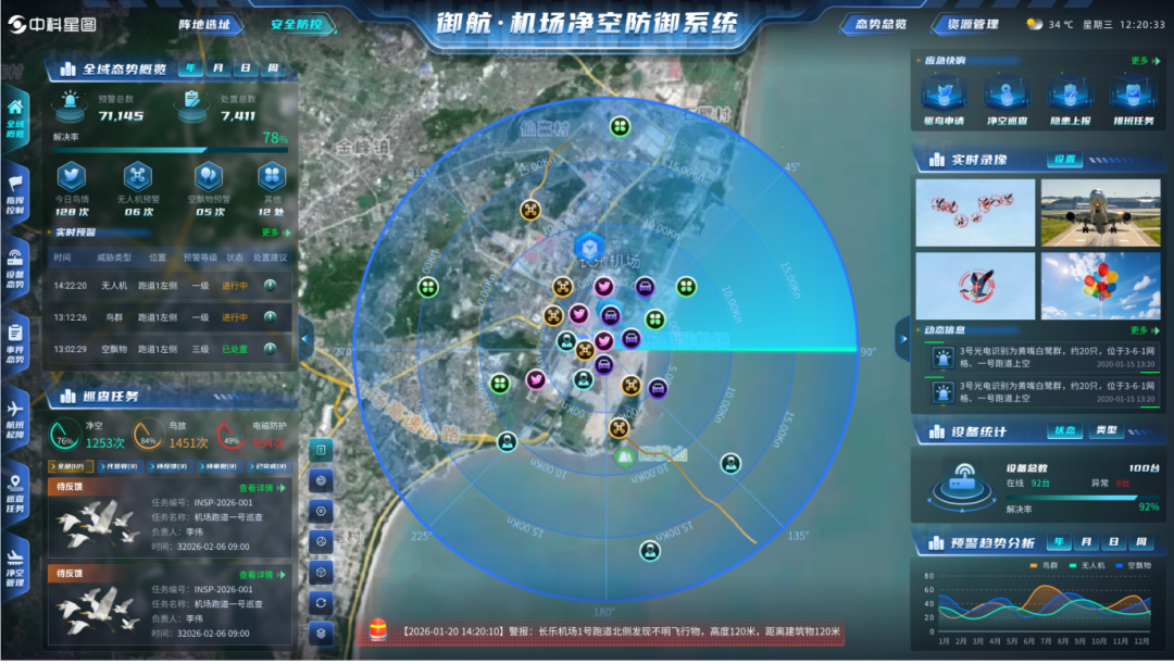 御航·机场安全防御系统是专为机场安全设计的“智慧大脑”,围绕安全感知、鸟防管控、航班跟踪、低空管理等核心业务场景,集成设备接入、数据融合、辅助分析、智能决策及协同指挥功能。系统通过融合UOM数据、ADS-B数据、雷光电融合数据、鸟防系统数据,构建立体化、网格化的探测网络,实现对机场区域的全域实时感知与精准防控,为机场安全运行打造智能基座。