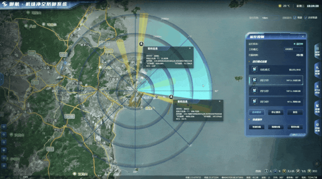御航·机场安全防御系统通过融合高精度三维数字孪生模型与设备性能数据,结合地理、建筑及电磁环境特征进行智能算法分析,自动生成覆盖探测盲区的最优设备布点方案,并依托三维可视化平台实现全域设备位置、状态与参数的实时集中管控,构建起“科学选址-动态部署-全维监控-统一指挥”的智能态势管理体系,确保防御资源布局最优化与指挥调度高效化。