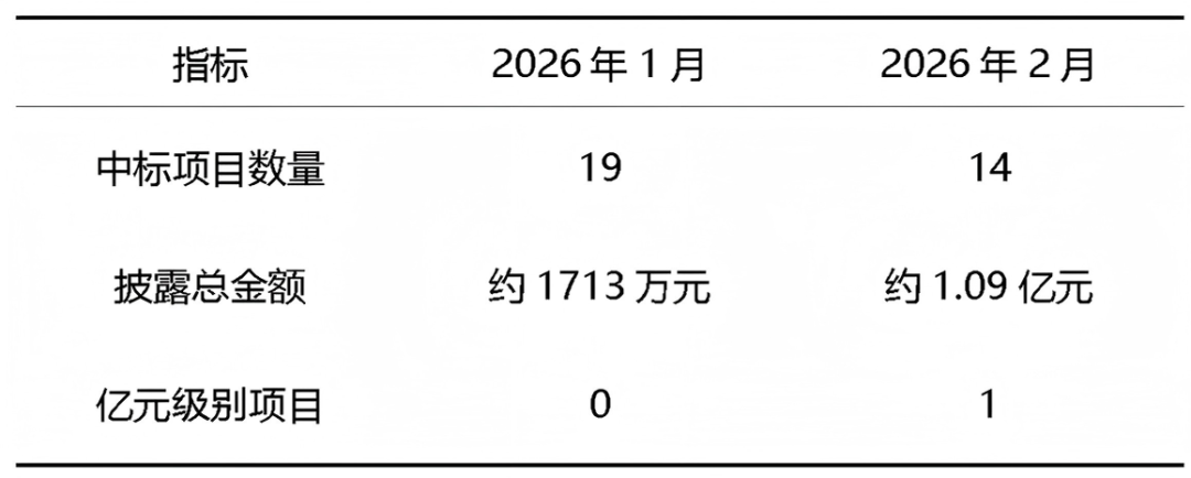 2026年的巡检机器人市场,以一份亮眼的成绩单开局。根据CMR产业联盟、新战略移动机器人产业研究所统计,1月全国巡检机器人中标19项,披露中标总金额约1713万元;2月全国巡检机器人中标14项,披露中标总金额约1.09亿元。两月合计披露33个项目,有效披露中标金额共计超1.1亿元。