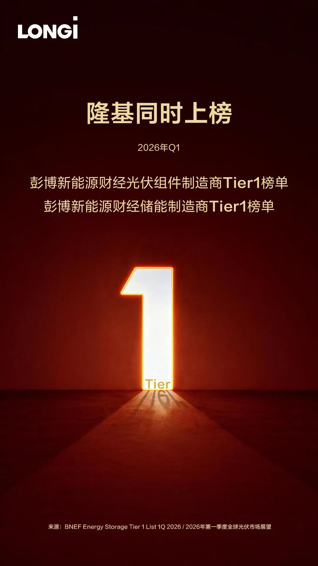 近日,全球能源领域权威研究机构彭博新能源财经(BloombergNEF)相继公布2026年第一季度“全球光伏组件制造商分级”与“全球储能系统制造商分级”名单。隆基凭借卓越的可融资能力与全球市场表现,再度入选光伏Tier 1一级组件厂商名单,并首次入选储能Tier 1名单。双重认可标志着隆基已完成从全球光伏领导者向“光储氢一体化”综合能源解决方案提供商的战略升级,储能业务开局即跻身全球第一梯队。