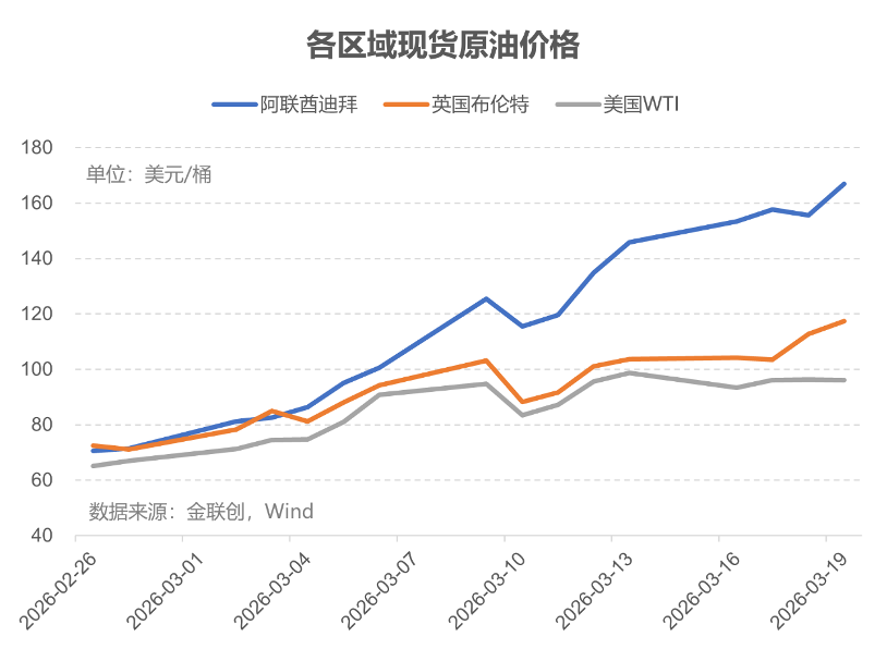 由于冲突导致霍尔木兹海峡运输停摆、贸易量锐减,中东原油基准价格升至历史新高,成为全球最贵的原油。3月19日,迪拜原油现货价格已达166.97美元/桶,相比布伦特原油的溢价已接近50美元/桶。