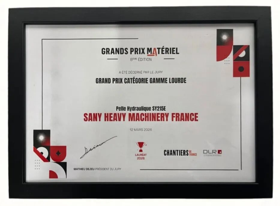 近日,在法国DLR(法国分销商、租赁商及维修商协会)年度颁奖盛典上,三一SY215E纯电挖掘机凭借卓越的创新技术和领先的环保表现,一举斩获“最佳重型设备特等奖”。