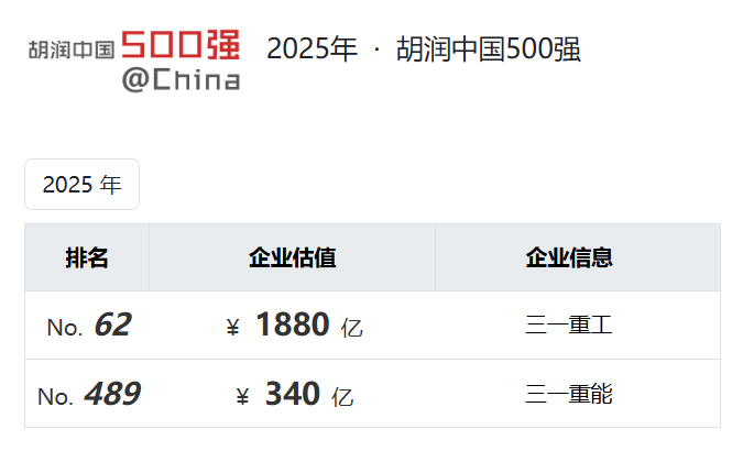近日,胡润研究院发布《2025胡润中国500强》(Hurun China 500 Most Valuable Private Companies 2025), 三一重工、三一重能齐齐登榜。