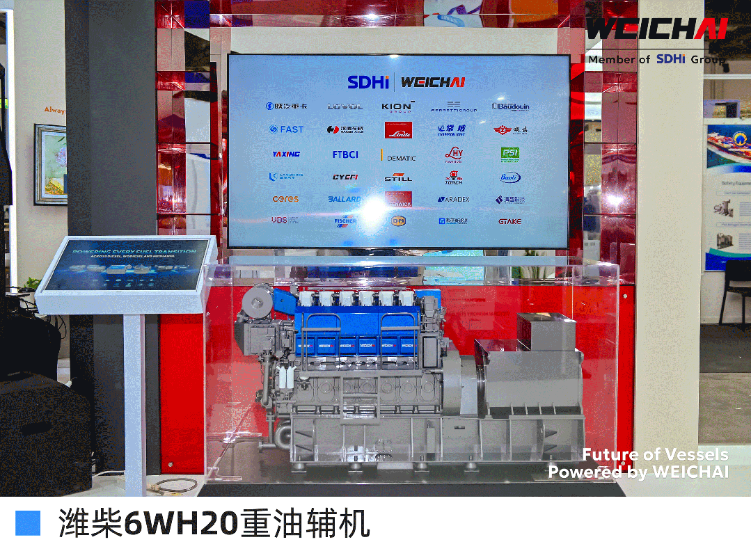 现场展区,三款传统能源动力产品以高效可靠、绿色节能与良好市场口碑,共同构成潍柴低碳能源转型的动力支撑。WH20重油辅机高可靠性满足主流航运需求;16M23展现高端艇用动力极致性能;12M26.3凭优异性能成为东南亚高销量机型。