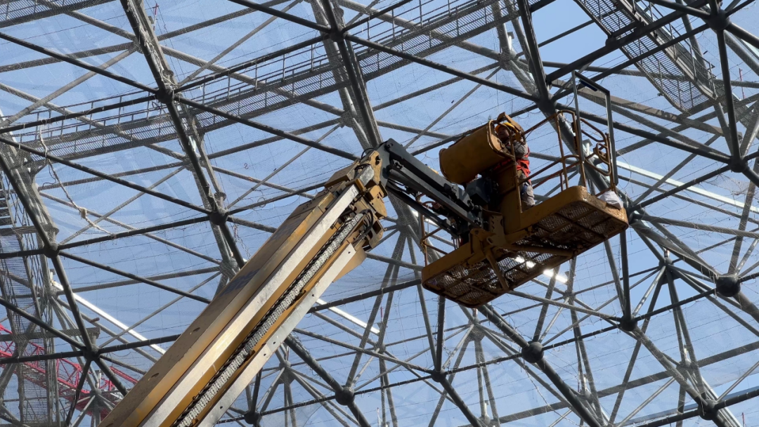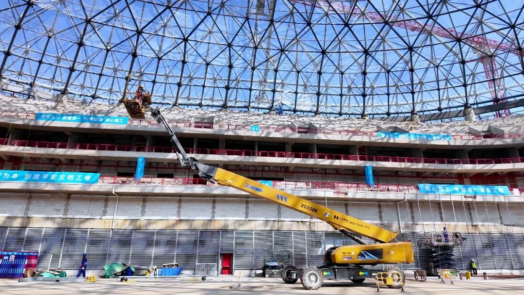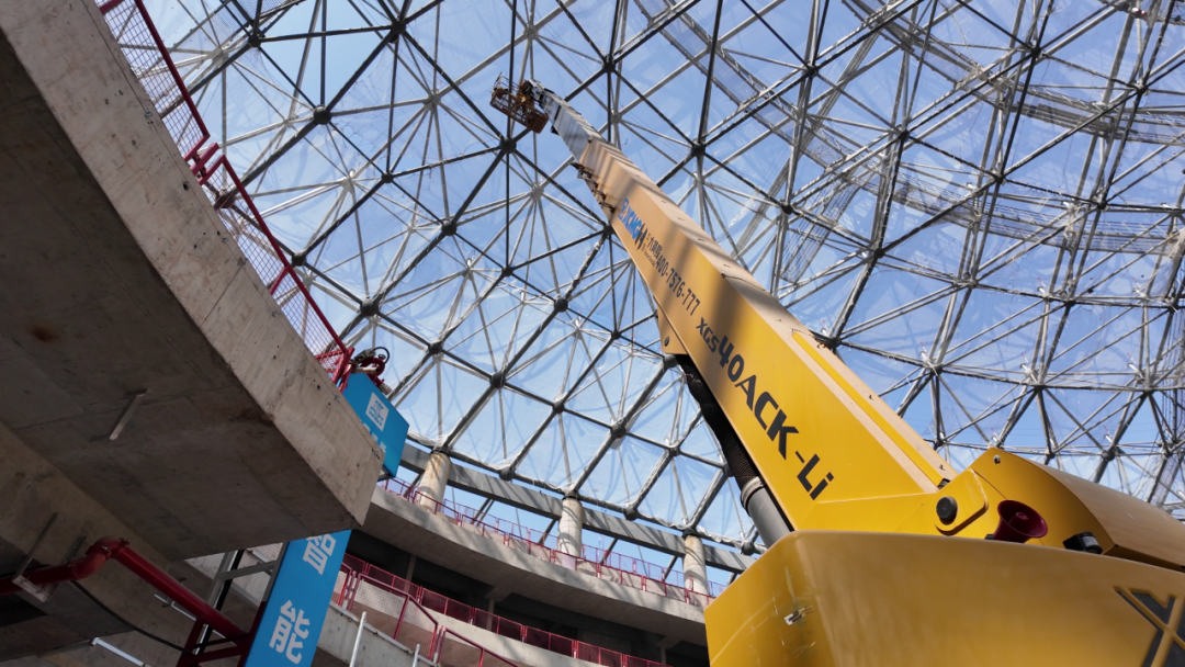 这样的结构,对高空作业设备提出了双重挑战:既要“身高够得着”,又要在堆满材料、辅料的场馆里灵活穿行、频繁移位。大跨度作业的覆盖难题,成为施工初期的一块“硬骨头”。