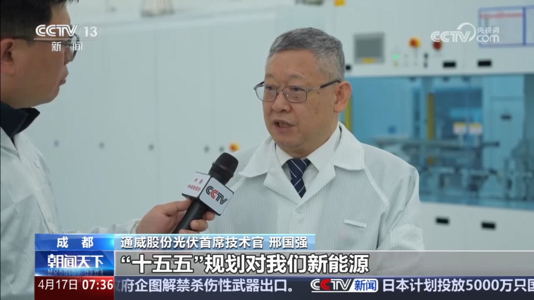 通威股份光伏首席技术官邢国强博士接受央视记者采访表示,“十五五”规划对新能源提出了明确的发展目标,这是一个巨大的增长空间。通威将继续加大研发力度,让光伏可以应用在水上、沙戈荒,甚至是太空,以适应光伏未来应用市场的需求。