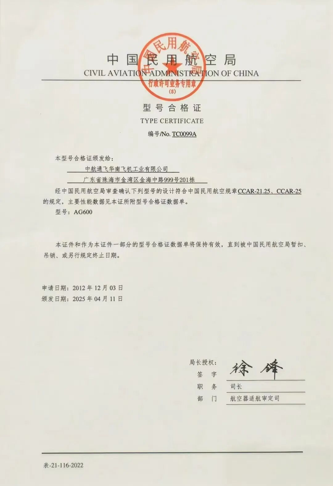 AG600飞机获颁中国民航局型号合格证