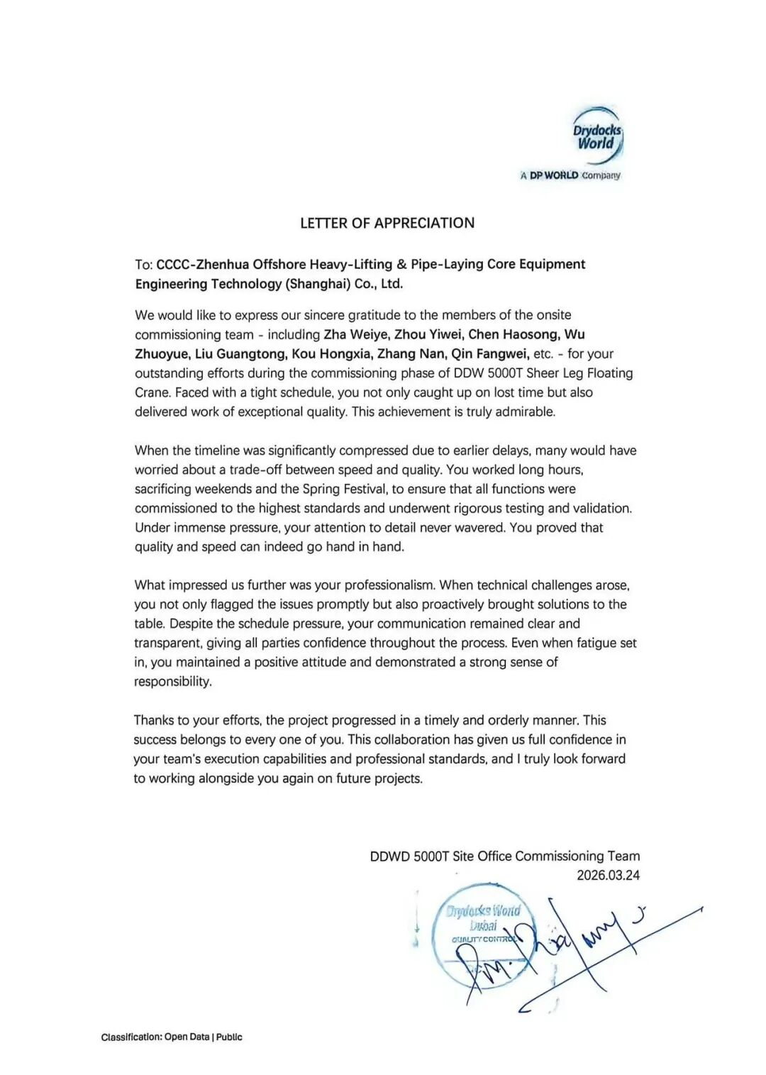 此次试验的成功,充分验证了该船起重机在极限工况下的系统稳定性与结构承载能力。为此,用户向公司发来了感谢信,高度称赞了设计与调试团队的执行力与专业态度。