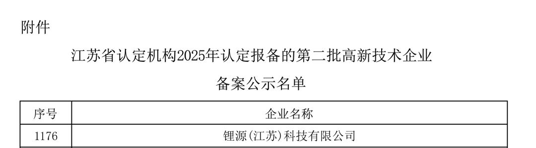 锂源科技江苏基地获“国家高新技术企业”认定